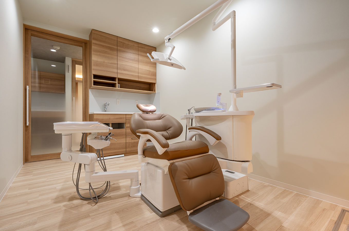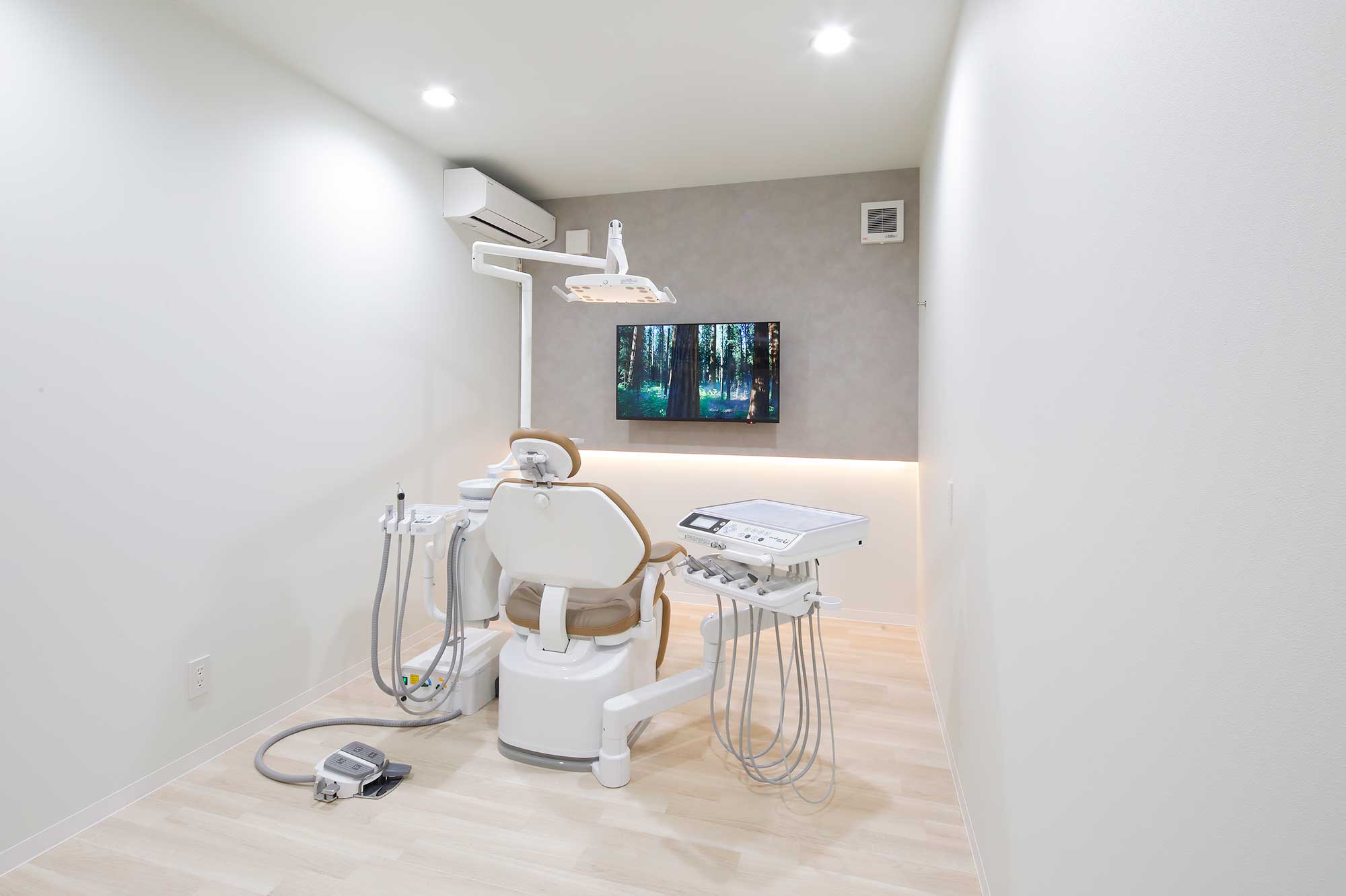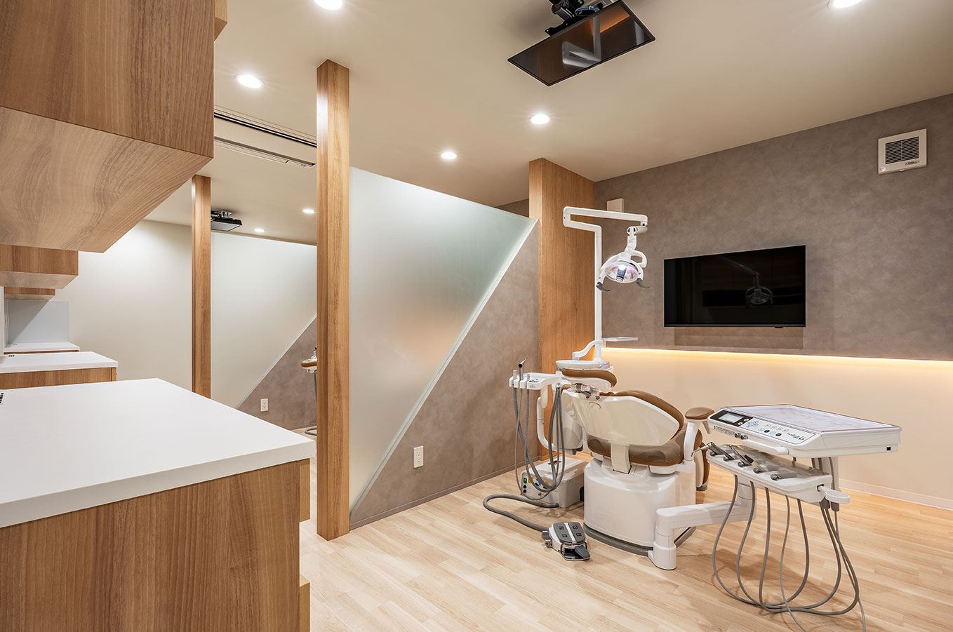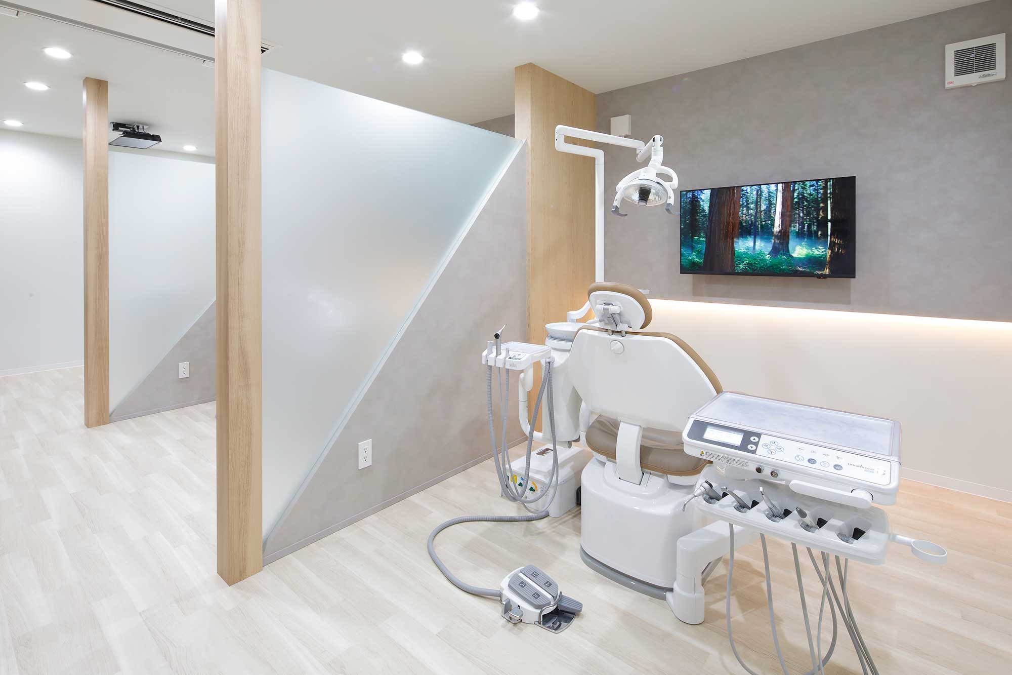 治療専用の個室エリアは、インプラント手術にも対応できる充実した設備を備えています。プライバシーが守られた落ち着いた空間で、患者さまがリラックスして治療に臨める環境です。前方には大きなテレビ画面を設置し、治療内容を丁寧に説明。患者さまとしっかりコミュニケーションを取りながら、不安を和らげることを大切にしています。